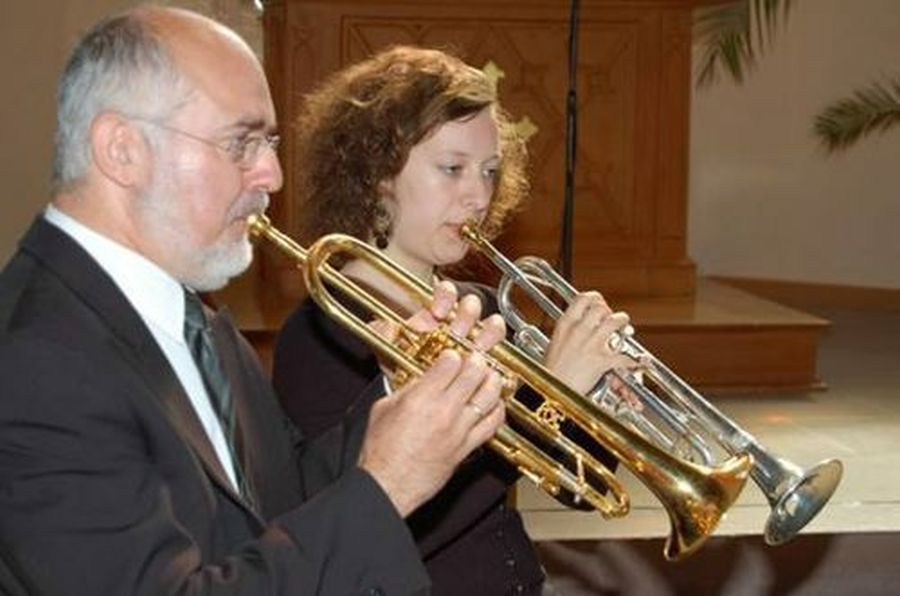 Axel Becker und seine Tochter Paulin an der Trompete. In der St. Georgs Kirche sind die Beckers sehr bekannt. Sie begleiten seit Jahren alle Kantatengottesdienste. Mit Virtuosität gespielte Bläsermusik erzeugt immer diesen Hauch von Festlichkeit.