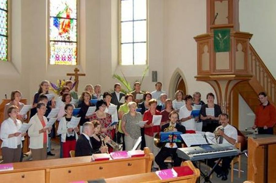Ev. Kirchengemeinde Öschelbronn-Kantatengottesdienst am 14.06.2009 Thema:„Lobe den Herrn, o meine Seele“ - die Kirnbachkantorei gestaltete durch die gleichnamige Kantate von G.Gunsenheimer den Lobpreis Gottes. Mit modernem Rhythmus erklang das Gospel/Rockfeeling von M. Schütz. Lobpreis in der St. Georgs Kirche – wie vielfältig Musik doch sein kann. Im Vordergrund das Bläserquartett um Axel Becker und Paukenspieler Jan Walter.