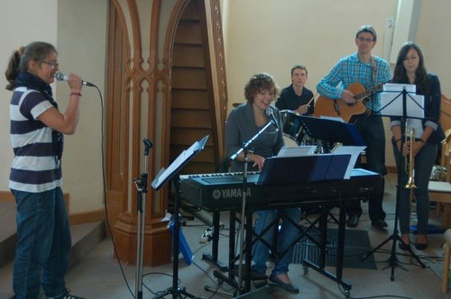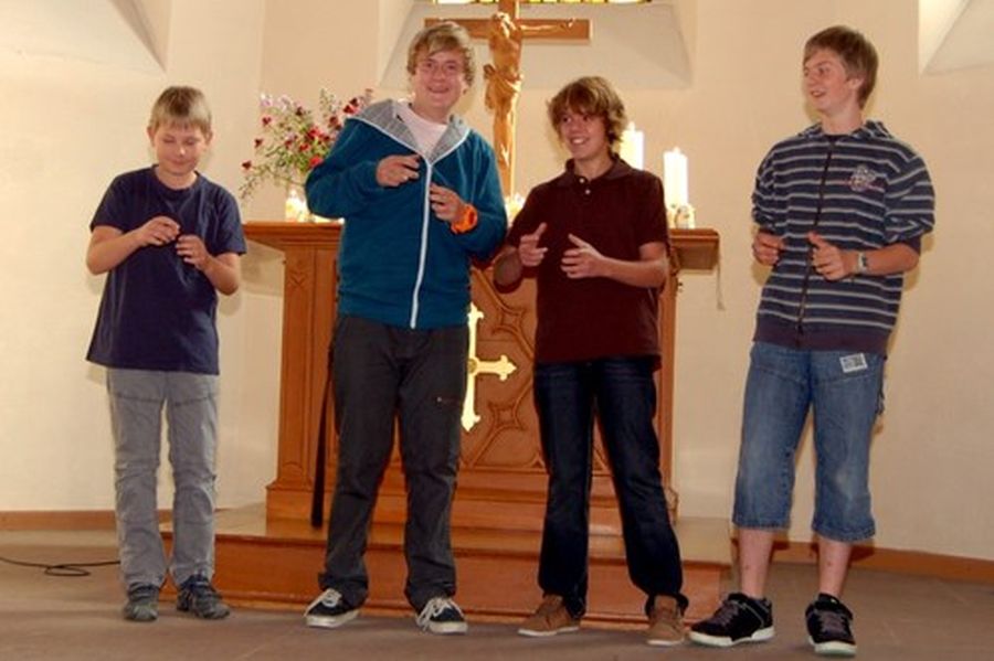Musizieren zum Lobe Gottes macht einfach Spaß und der Gemeinde gefällt es auch – hier: Marie Claire Kilian, Anika Friesinger, Lea Friesinger, Paul Rehberg
