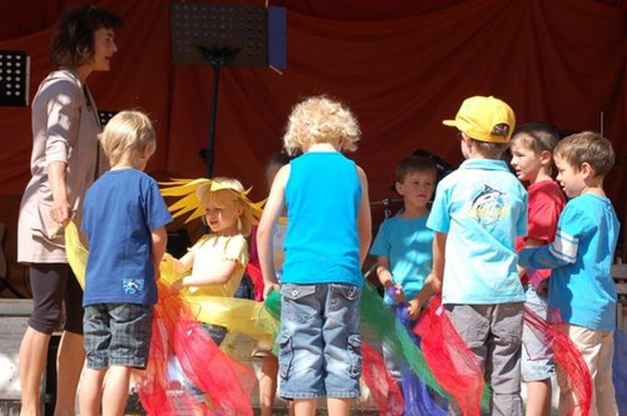 Die Kindergruppe der musikalischen Früherziehung mit Frau Britsch führte einen Reigentanz vor – farbenfroh, mit bunten