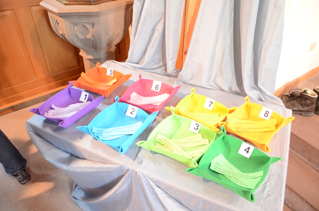 Die Bergpredigt mit den Seligpreisungen ist vielen Zeitgenossen bekannt. Trotzdem ist es von Zeit zu Zeit richtig und sinnvoll sich über deren Inhalt Gedanken zu machen. Nach der Predigt hatten die Gottesdienstbesucher die Möglichkeit, sich aus einem der schönen farbigen Filzkörbe, eine für ihn ansprechende Seligpreisung auszusuchen. Diese Aktionen werden von den Anwesenden gerne angenommen. Bleibt der Wunsch für die kommenden Wochen, dass die farbigen Zettel, so manchen Arbeitsplatz oder Kühlschrank schmücken. Den Inhalt nicht aus dem Blickwinkel zu verlieren ist Sinn und Zweck der Vertiefung. An der Umsetzung täglich zu arbeiten ist Aufgabe aller Christen.